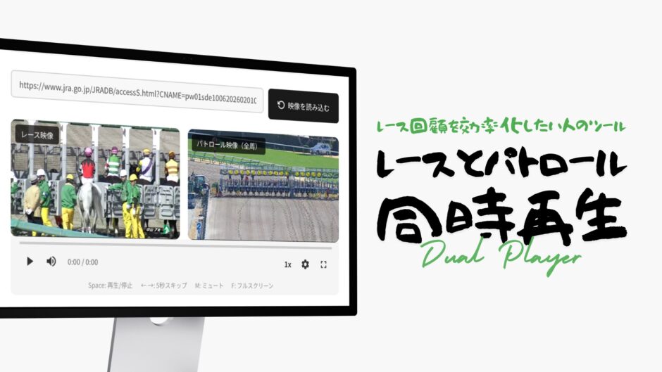 ホーム競馬ツール 【レース回顧を効率化する】レース映像とパトロールビデオを同時再生するツール 2026年3月2日 SHARE ポスト シェア はてブ LINE JRA デュアル映像プレイヤー レース映像とパトロール映像を同時に再生します。JRA公式のレース結果URL、またはターゲットIDを入力してください。 映像を読み込む リセット 動画情報を取得中… レース映像 パトロール映像(全周) 0:00 / 0:00 1x 0.25x 0.5x 0.75x 1x 1.25x 1.5x 2x Space: 再生/停止 ← →: 5秒スキップ M: ミュート F: フルスクリーン コメントを残す コメントをキャンセルメールアドレスが公開されることはありません。 ※ が付いている欄は必須項目ですコメント ※ 名前 ※ メール ※ サイト 次回のコメントで使用するためブラウザーに自分の名前、メールアドレス、サイトを保存する。 Δ